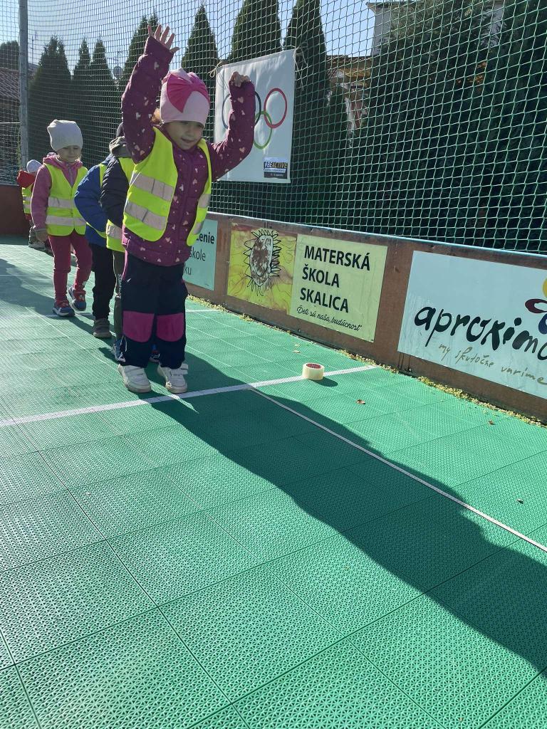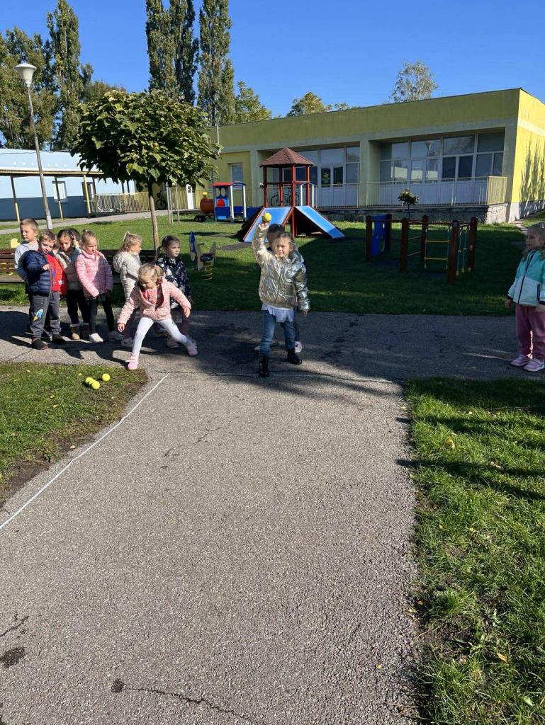 Hod loptičkou na cieľ: Kde sa preukázala presnosť a sila malých rúk. Aj keď nie každá loptička pristála presne, radosť z hodu bola obrovská!
