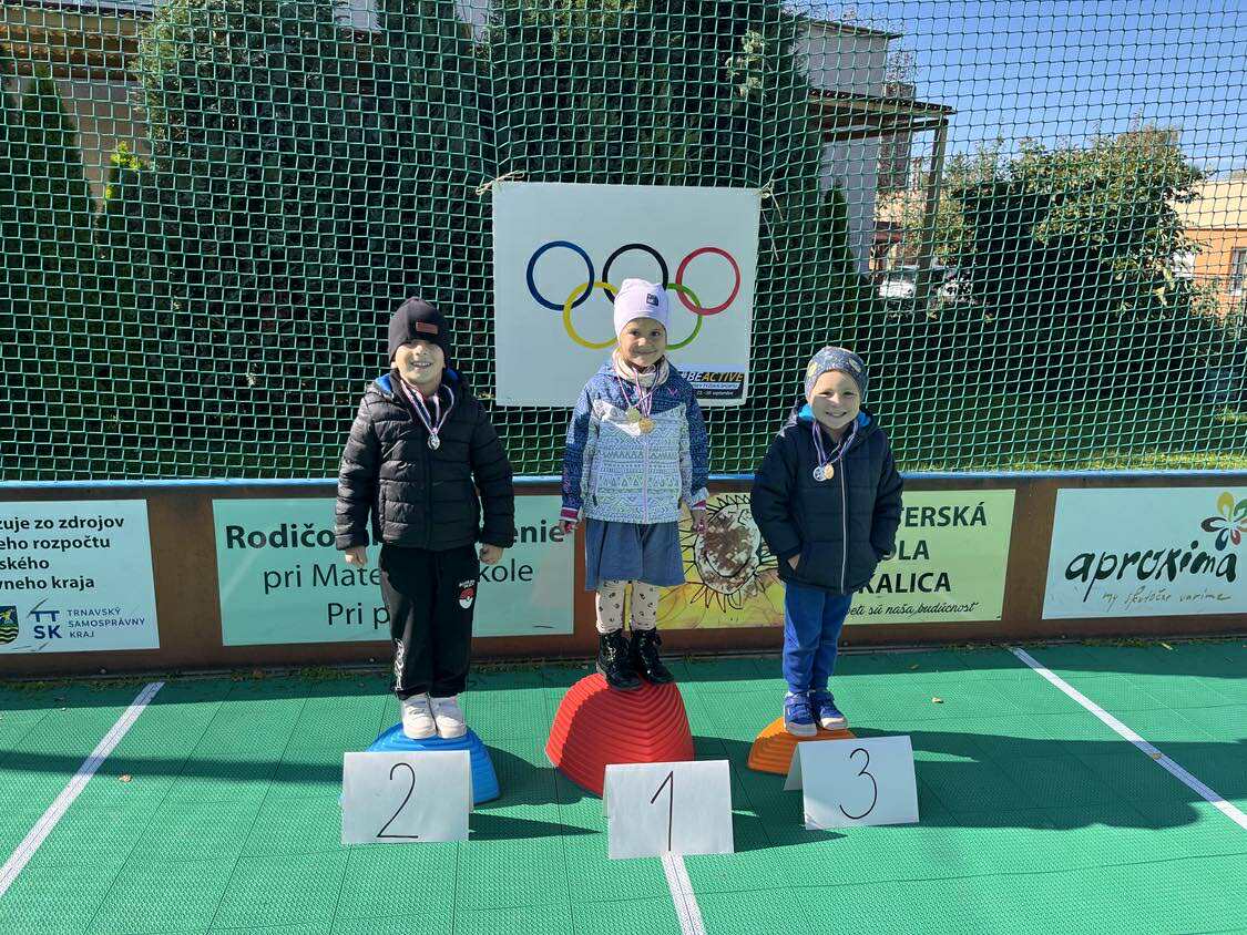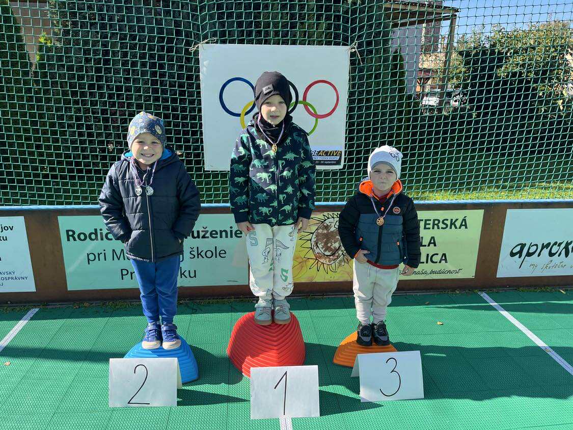 Počasie nám prialo, slniečko svietilo a vytvorilo tak ideálne podmienky pre mladých športovcov! Deti súťažili v troch disciplínach. Deti sa rozdelili do troch skupín podľa veku a súťaženie v disciplínach mohlo začať.