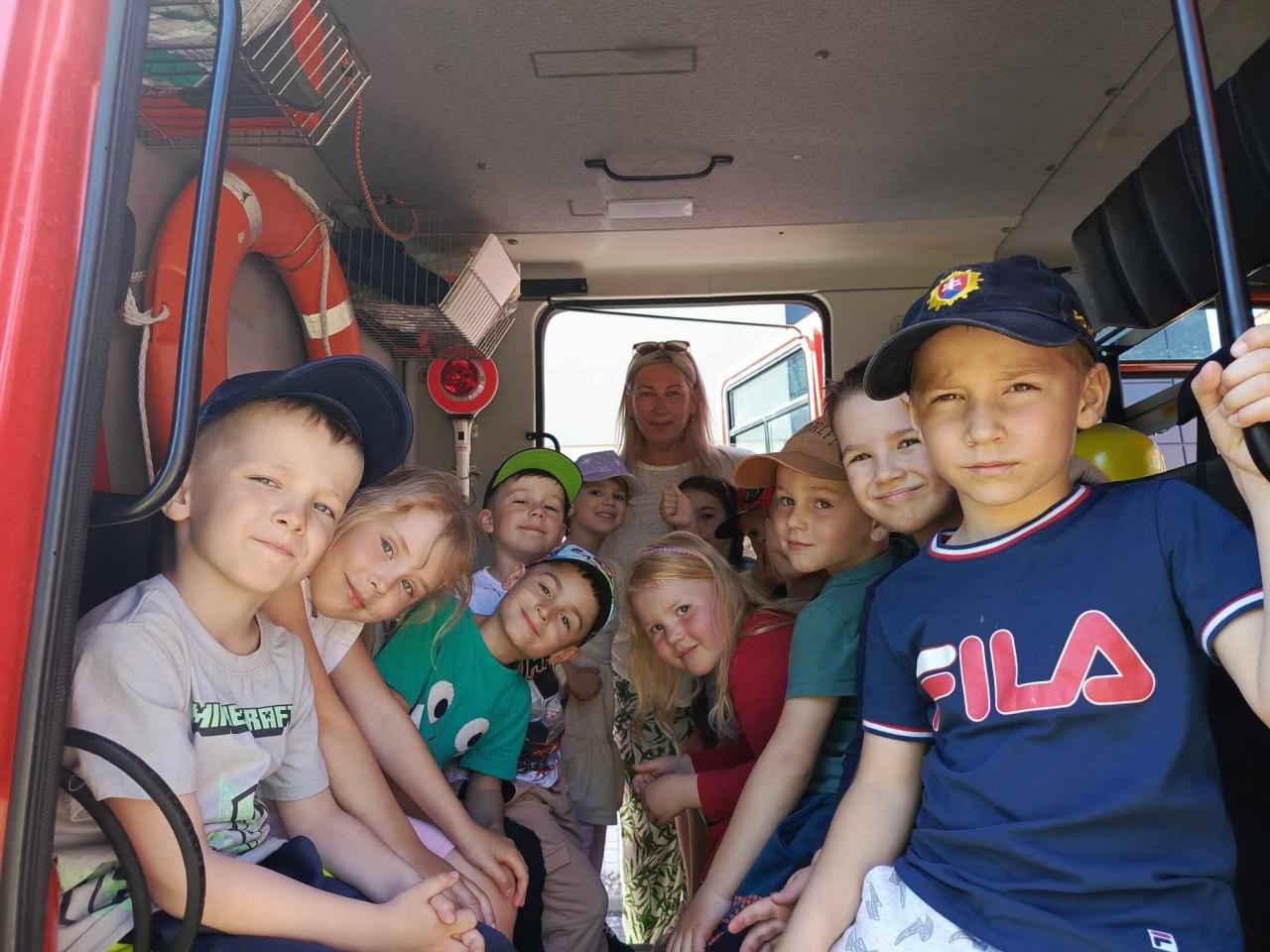 Ich návšteva bola súčasťou preventívno-vzdelávacej akcie, ktorej cieľom bolo priblížiť deťom prácu hasičov a naučiť ich, ako sa správať v prípade požiaru alebo inej mimoriadnej udalosti. Akcia sa začala veselým privítaním a rozprávaním o tom, čo všetko hasiči robia – od hasenia požiarov cez záchranu ľudí až po pomoc pri dopravných nehodách. Najväčšou atrakciou bola praktická ukážka. Deti si mohli sadnúť do hasičského auta, vyskúšať prilbu a dokonca si aj pod dozorom hasičov „uhasiť požiar“ pomocou skutočnej hadice. Striekanie vody zo zásahovej techniky vyvolalo obrovské nadšenie, úsmevy a detský smiech sa ozýval široko-ďaleko. Veríme, že sa deti naučili niečo nové, zbavili sa strachu z uniformovaných zložiek a odniesli si krásny zážitok.