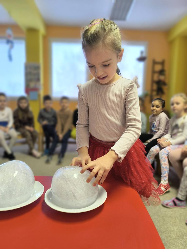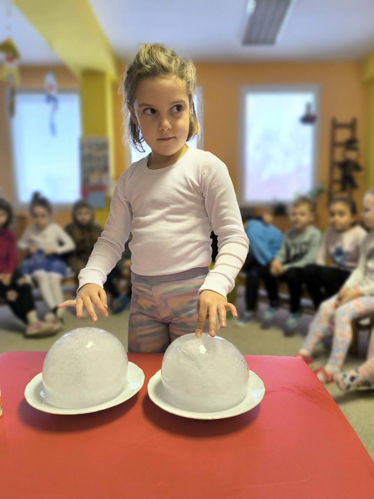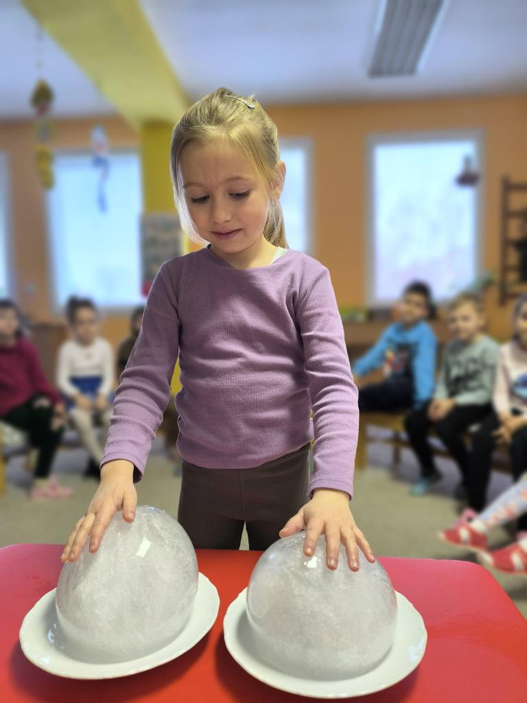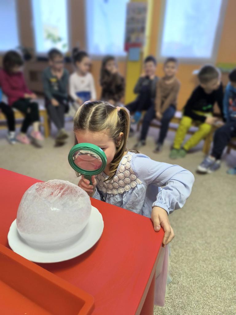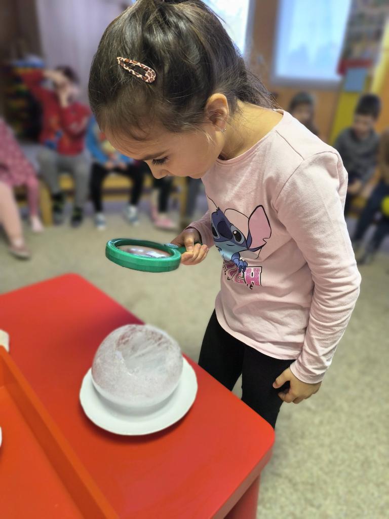Do balónikov naliali vodu a položili ich na celú noc pod krík na školský dvor. Na druhý deň už netrpezlivo očakávali, čo sa s vodou v balónikoch stalo. Zistili, že voda už netečie, je tvrdá a veľmi studená. Voda sa v balónikoch zmenila na ľad a vznikli nám krásne ľadové gule, ktoré pripomínali pštrosie vajcia. Deti ľad skúmali pomocou lupy, hmatom si všímali jeho základné vlastnosti : studený, hladký, pri dotyku teplých rúk sa topí. Deti formou aktívneho pozorovania, porovnávania a vyvodzovania záverov pochopili, že voda sa môže meniť podľa teploty. Pokus deti veľmi zaujal, podporil ich zvedavosť a radosť z objavovania prírodných javov.