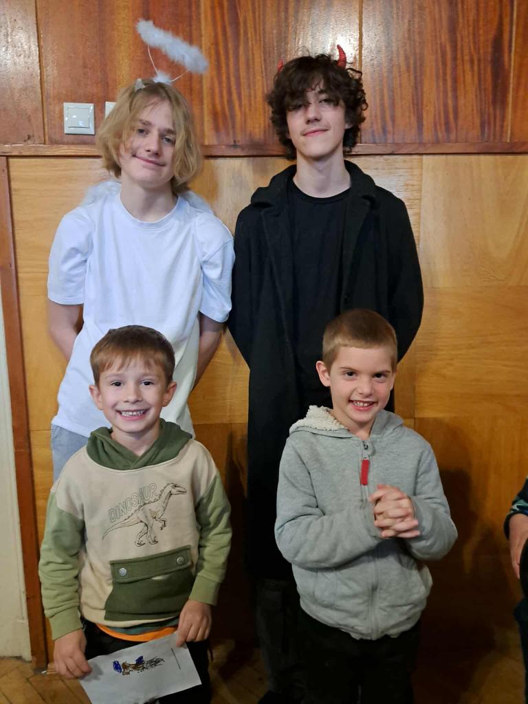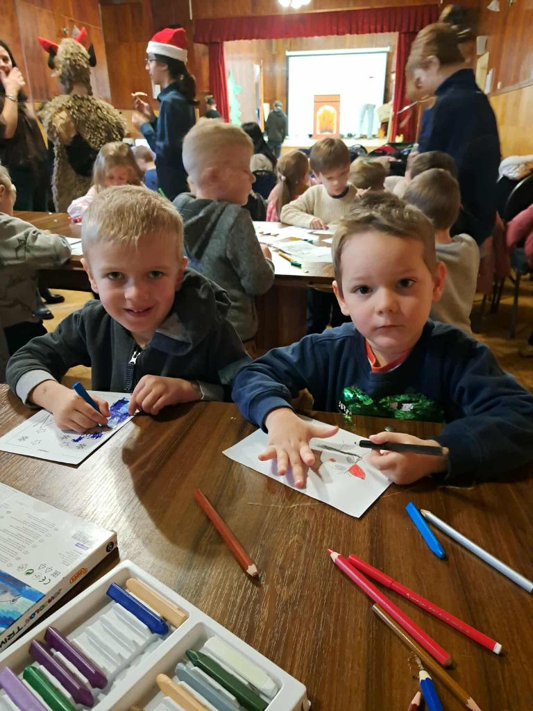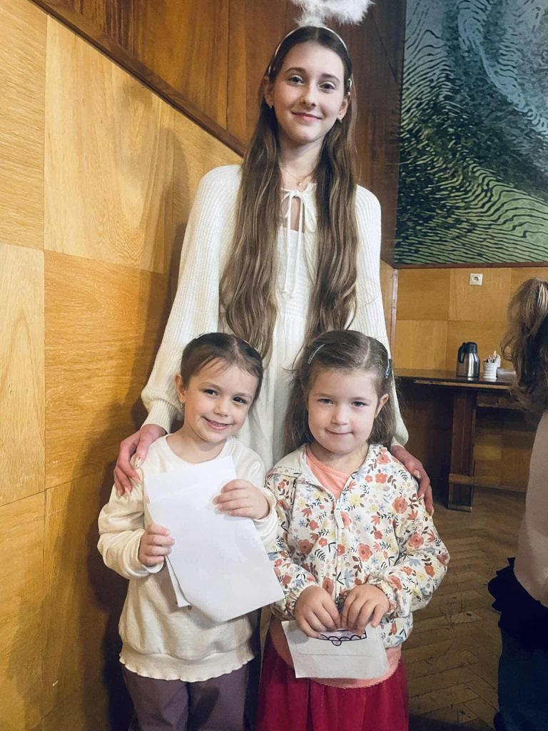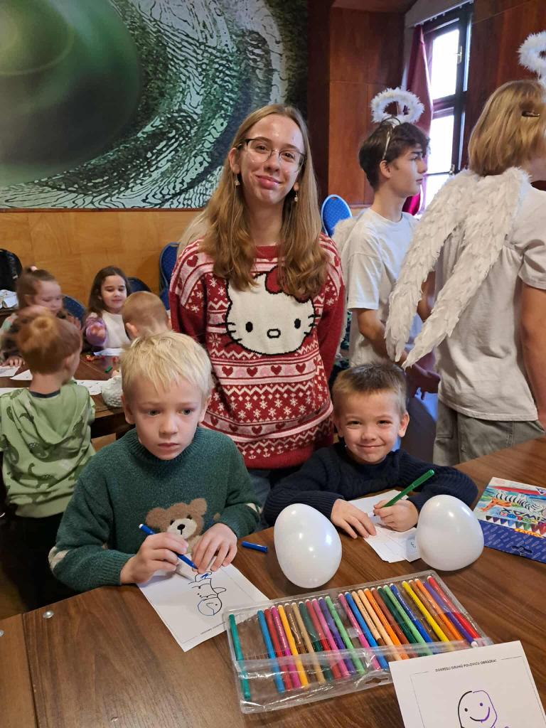 Hneď na úvod nás privítali dve divadelné predstavenia. Prvé rozprávkové predstavenie „O čarovnom bubienku“ vtiahlo deti do sveta kúziel. Druhé predstavenie „Vianoce s anjelmi a čertami“ zasa prinieslo úsmev, veselú atmosféru a pripomenulo deťom, že sviatky sú najkrajšie vtedy, keď sú plné dobra a porozumenia. Deti sledovali dianie na javisku so zaujatím a nejedno z nich dokonca prežívalo príbeh spolu s hercami. Po divadelnej časti nasledovalo hudobné prekvapenie – študenti zahrali vianočné koledy na husliach a klavíri, čím vytvorili príjemnú sviatočnú náladu. Melódie sa niesli celou miestnosťou a deti si ich s úsmevom pospevovali. A to najlepšie prišlo nakoniec. Študenti si pripravili pre našich škôlkarov vianočné dielničky, kde sa mohli naplno kreatívne vyžiť. Deti zdobili medovníčky, riešili vianočné úlohy, vyfarbovali sviatočné obrázky a spoznali aj „rozprávkové bytosti“ z predstavenia. Každé dieťa odchádzalo s maličkou pamiatkou na tento deň – medovníkom, obrázkom, balónikom a tí najodvážnejší si odniesli dokonca aj podpis od čerta, čo vyvolalo veľké nadšenie. Ďakujeme študentom a pedagógom z gymnázia, ktorí pre našich škôlkarov pripravili milý vianočný program.